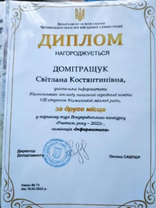 Світлана Костянтинівна постійно перебуває у творчому пошуку, її самовдосконаленню немає меж, тому у цьому навчальному році вона спробувала реалізувати свої педагогічні надбання, взявши участь у І (обласному) турі Всеукраїнського конкурсу "Учитель року-2022" у номінації "Інформатика". Учителька виявила високий рівень підготовки та творчий підхід під час участі у конкурсі. Крок за кроком, випробування за випробуванням – і Домітращук С.К. піднялася на свій педагогічний Олімп, ставши призером, здобувши почесне ІІ місце. Ми щиро вітаємо нашу колегу з високим результатом та бажаємо й надалі впевнено крокувати своїм визначеним творчим шляхом. Адже знаємо, що ваш маршрут-особистість, її розвиток, вдосконалення.