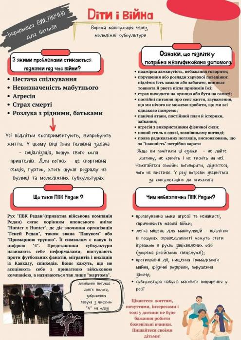Соціальним педагогом Оксаною Прокопець розкрито питання на тему: "ПВК "Редан": хто вони такі та чим загрожують українським підліткам?". Інформаційні матеріали, буклети «Діти і війна» про ворожу маніпуляцію через молодіжні субкультури надані головам класних батьківських комітетів для поширення серед батьків класів.