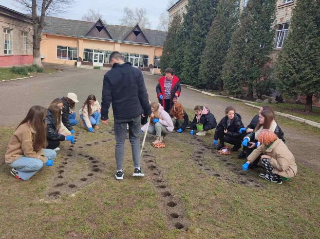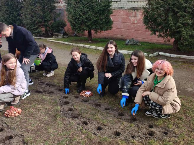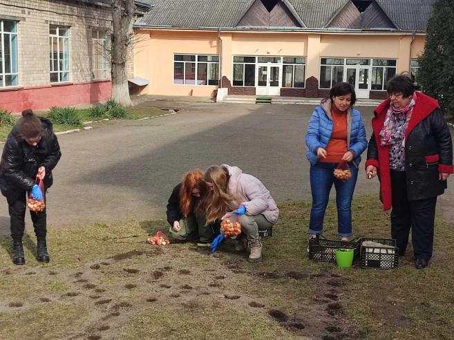 "Зацвітуть квіти - зацвіте Україна!" - саме під таким піднесеним гаслом з приходом весни вдалося здійснити висадку тюльпанів, які учні закладу отримали завдяки участі у прекрасному благодійному проєкті #flowers4school , організатором якого є інтернет-магазин "Florium.ua". Висажування тюльпанів у формі тризуба мало на меті не тільки естетичну спрямованість, але й сприяло підняттю патріотичного духу старшокласників. З нетерпінням чекаємо, коли ці весняні квіти зацвітуть яскравими барвами та принесуть нам довгоочікувану Перемогу!
