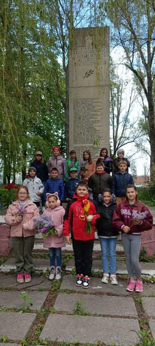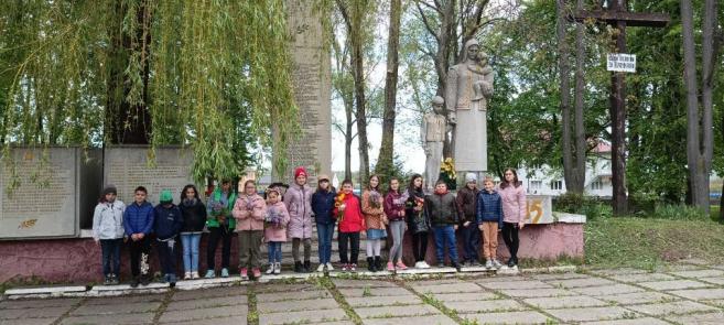 Діти поклали квіти до пам’ятника загиблим воїнам та вшанували пам’ять полеглих героїв нинішньої та Другої світової війни хвилиною мовчання.