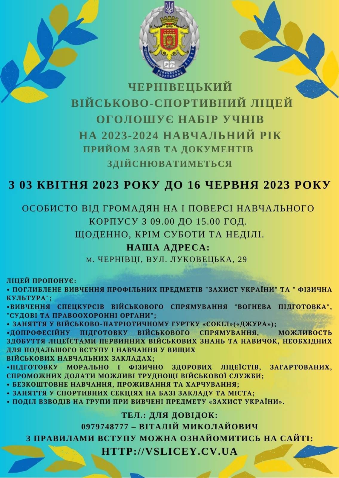 Чернівецький військово-спортивний ліцей оголошує набір учнів на 2023/24 н.р.