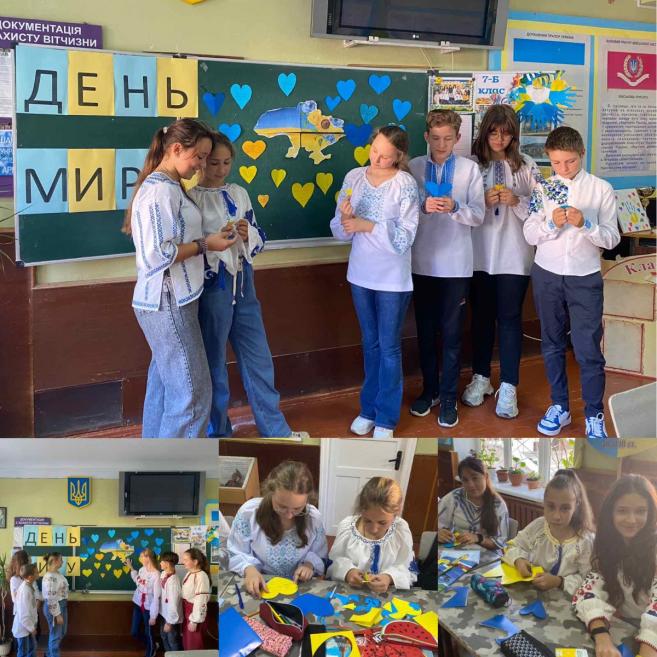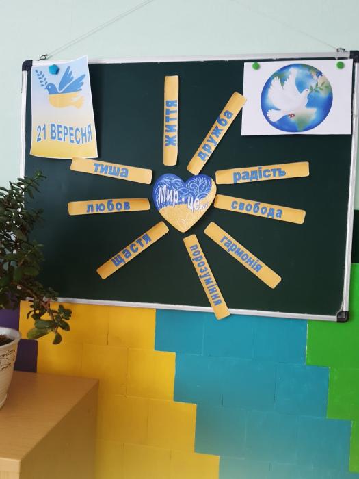 З нагоди Дня миру у закладі пройшли тематичні заходи. Зокрема, учні школи ІІ ступеня долучилися до святкування з флешмобом "Ми за МИР". Діти школи І ступеня малювали малюнки з побажаннями миру, щастя та чистого неба. Учні 2 класів залучені до бібліотечного уроку та декламування віршів про мир. У всіх класах проведені години спілкування, на яких виготовлялися паперові голуби як символ миру та духовного розвитку нації.