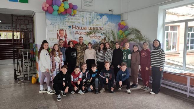 На згадку про зустріч Юрій Якович подарував учням шеврон 4 артилерійського дивізіону, що перебуває у складі 47 окремої артилерійської бригади, де він несе службу.