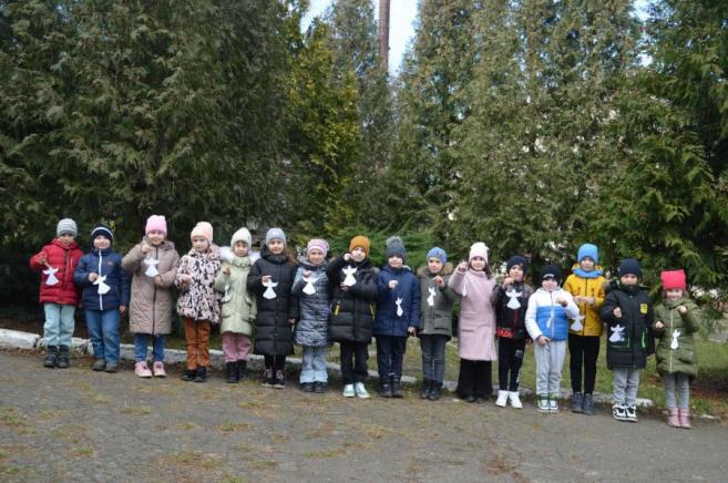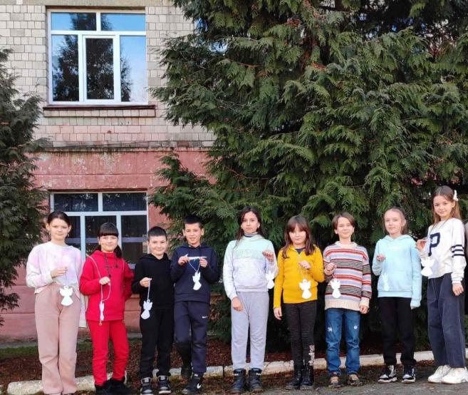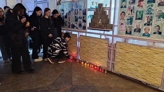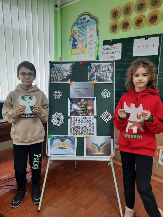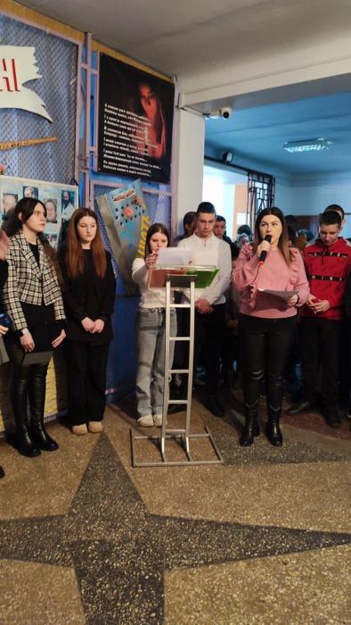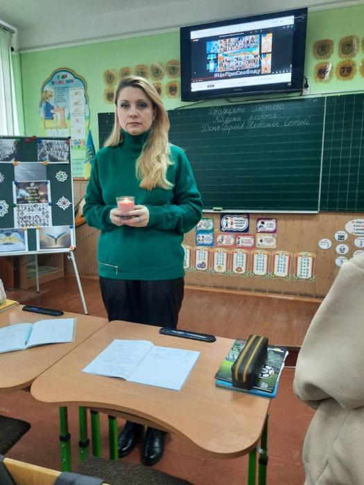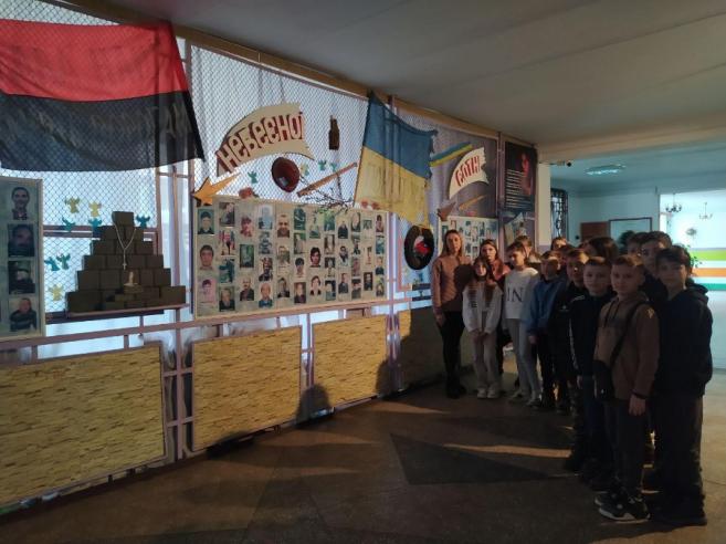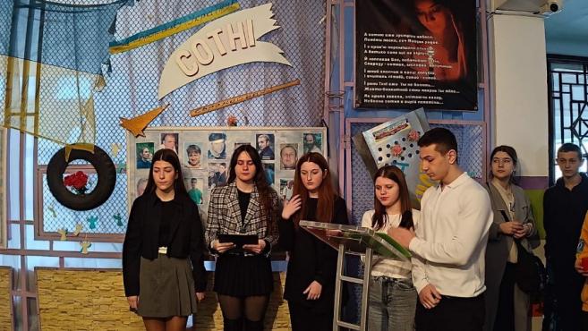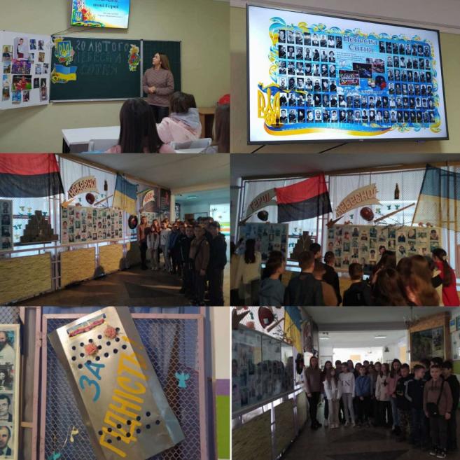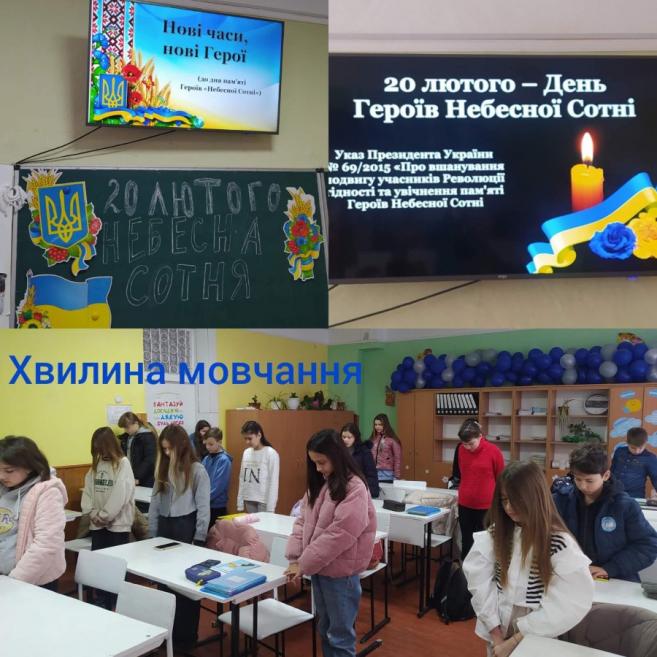Учні вшанували пам'ять героїв мовчазною митью та поклали квіти до пам'ятника, що стоїть у нашій школі. Після цього, обговорили значення подій 2014 року для України та важливість пам'яті та відданості своїй країні.